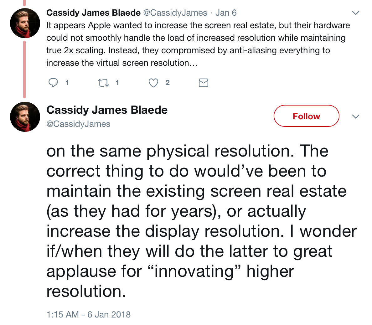 Apple опередили индустрию, выпустив ноутбуки с дисплеями Retina еще в 2012 году, и написали ПО, которое на тот момент работало практически идеально. Спустя 5 лет их решения в софте уже не выглядят так хорошо, вынуждая Apple или закупать более дорогие дисплеи, или снижать качество продукта. Обидно, что с новыми ноутбуками они пошли по второму пути.