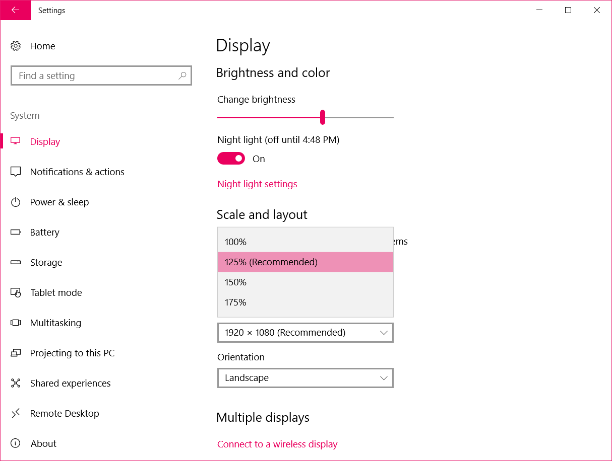Windows 10 позволяет регулировать масштаб в довольно больших пределах; вне зависимости от настройки масштабирования, система будет генерировать изображение в разрешении, которое является родным для монитора, но соответствующим образом увеличивать элементы интерфейса.