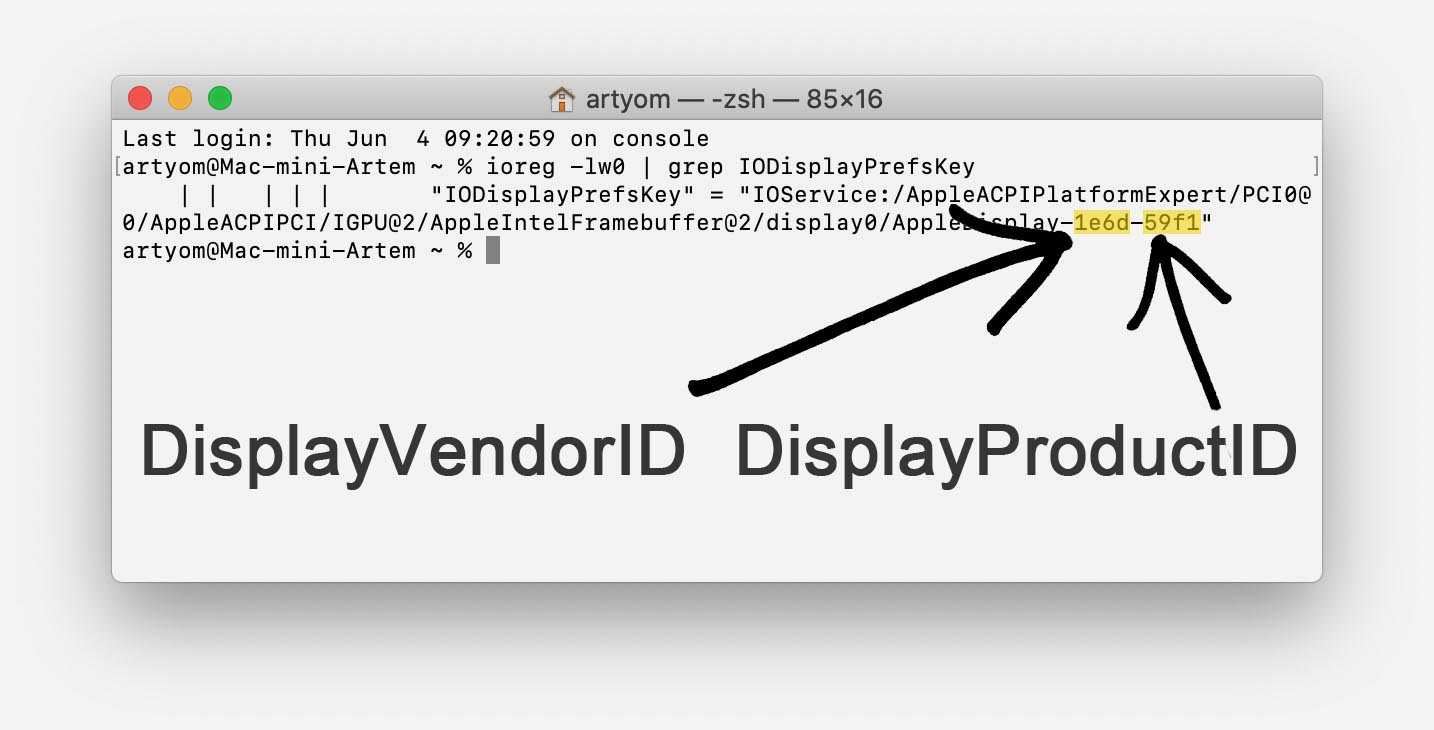 Если вводите команду на MacBook с подключенным монитором, система выдаст информацию как о штатной матрице, так и о внешнем дисплее. Вам нужны данные из строки, в конце которой указано “AppleDisplay”, строка с отметкой “AppleBacklightDisplay” нам не нужна.