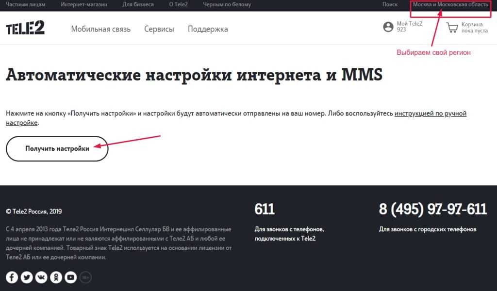 На сайте можно получить настройки интернета Теле2. Для этого следует войти в свой профиль в сервисе. Нужна страница находится здесь: https://msk.tele2.ru/mobile/internet/settings. На ней нажмите «Получить настройки» и подтвердите операцию.