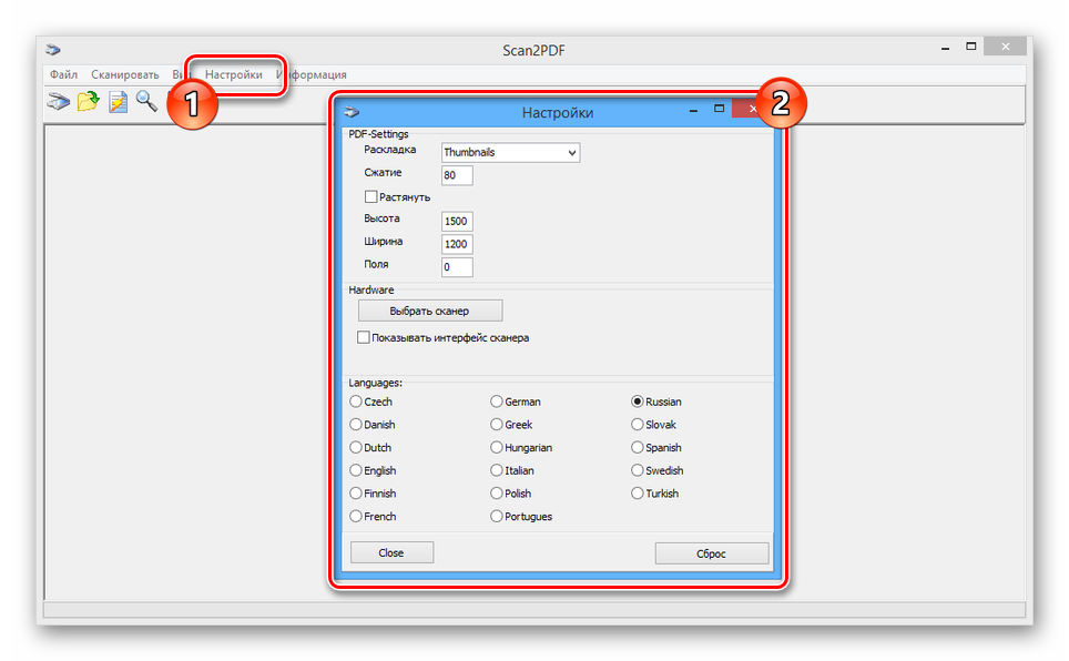 Завершив процесс установки и открыв Scan2PDF, для удобства можно поменять язык интерфейса на «Русский» через раздел «Настройки».