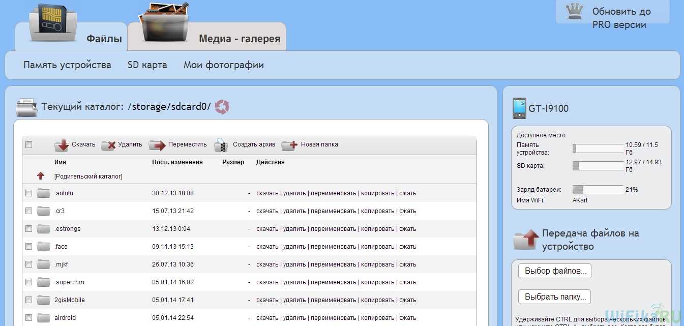 В правой колонке отображается информация о количестве использованного места, а также индикатор батареи телефона. Можете поиграться со всеми этими файлами, но нас сейчас интересует вопрос — как передать файл на телефон через WiFi?