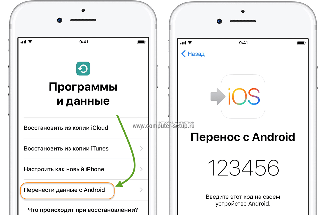 2При первичной настройке Айфона на странице под названием «Программы и данные» нажмите «Перенести данные с Android».