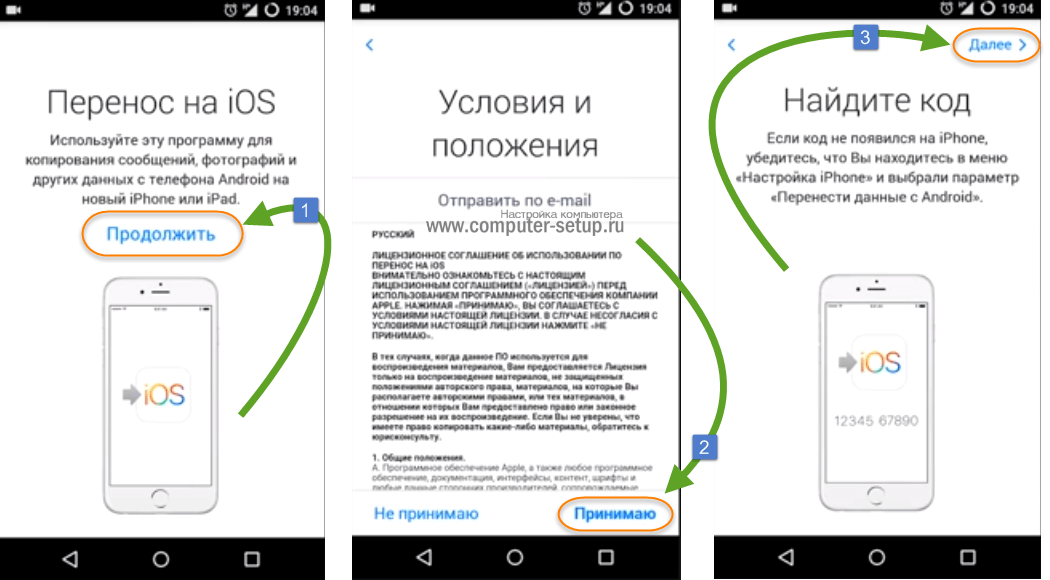 4На телефоне Android запустите Move to iOS, нажмите «Продолжить», примите условия соглашения (нажмите на надпись «Принимаю» справа внизу) и «Далее» в правом верхнем углу окна.