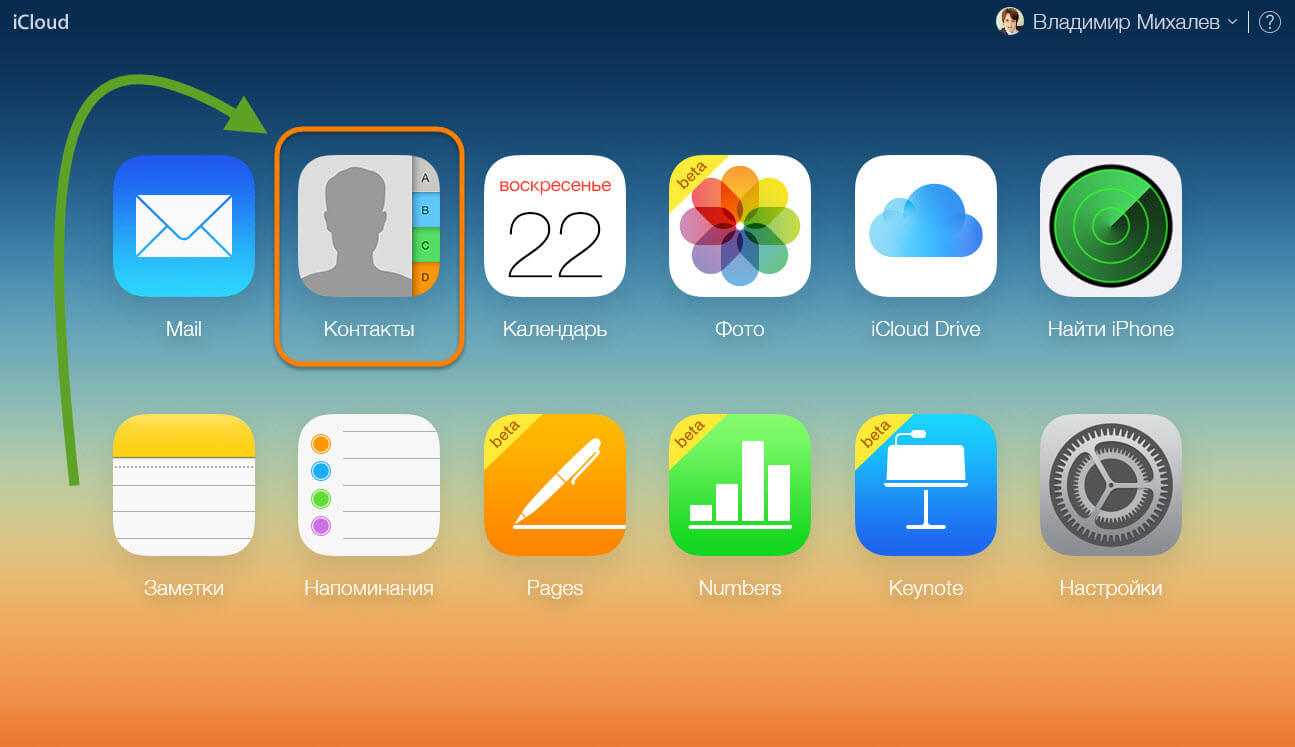 - По окончанию процесса, перейдите в iCloud и запустите пункт «Контакты».