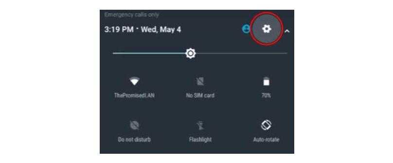 Помимо рассмотренных вариантов с касаниями экрана довольно легко режим активируется из панели быстрых настроек, которая также называется «Панель уведомлений». Открытие происходит свайпом сверху вниз на главном экране смартфона. В появившемся окне можно заметить иконку в виде шестеренки. Ее и следует нажать, так как тап по символу позволит быстро открыть настройки устройства.