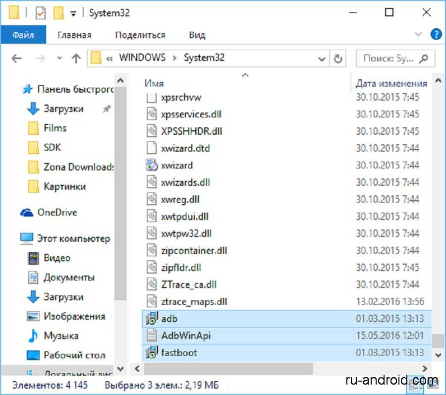 3.Некоторые файлы из папки которая находится в C:\SDK\sdk\platform-tools нужно скопировать в папку Windows\System32, а именно: adb.exe, AdbWinApi.dll, fastboot.exe.