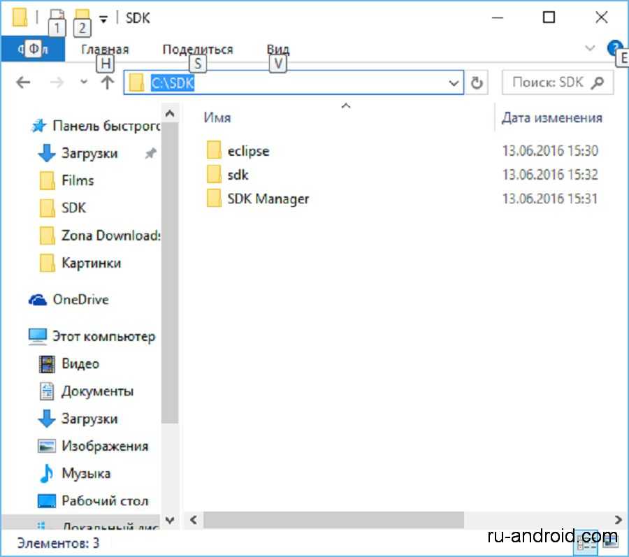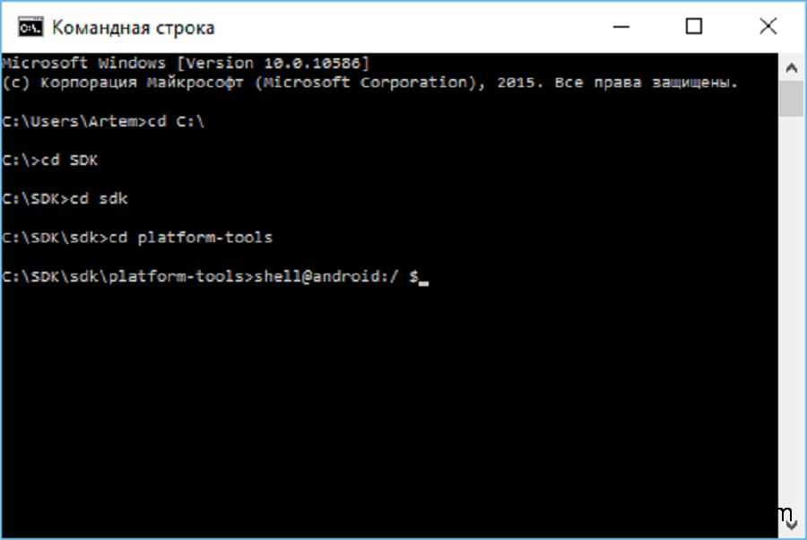 5. Теперь переходим в подкаталог platform-tools каталога SDK. Для этого введите команды, как показано на картинке.