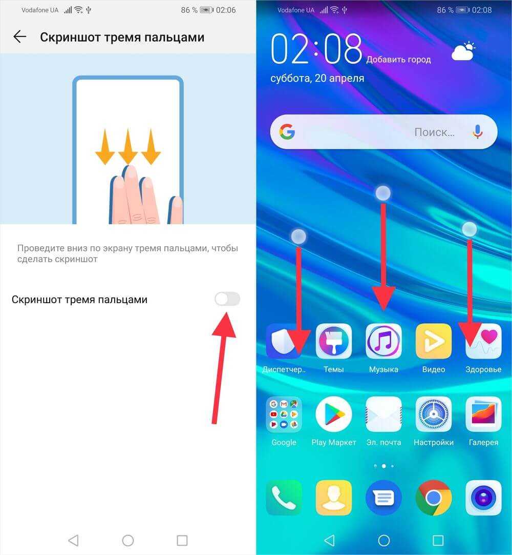 Есть два варианта умного снимка: проведение по экрану 3 пальцами и постучав костяшкой пальца по дисплею (после обновления до EMUI 9 не работает). Опция находится в разделе «Параметры» – «Управление» – «Движения» – «Скриншот тремя пальцами».