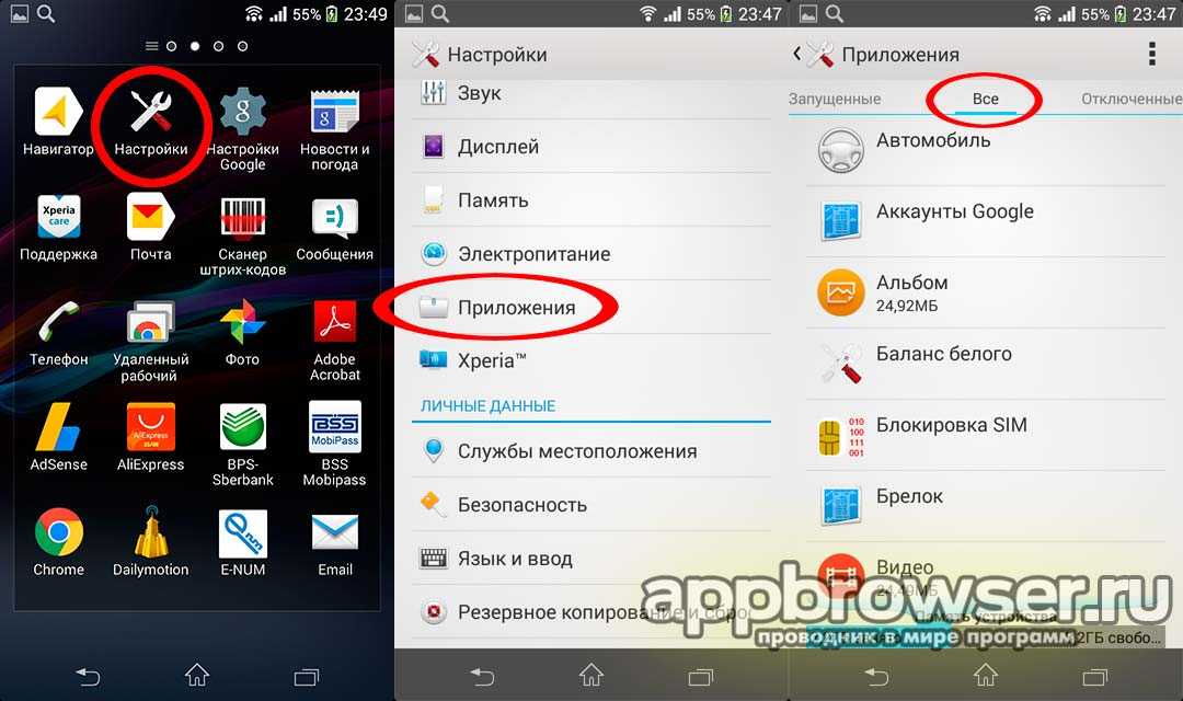Итак, для отключения приложения необходимо зайти в настройки, пункт приложения и переключиться на вкладку Все: