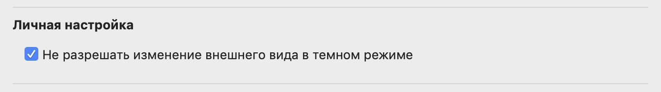3. Нажимаем на неё, в открывшемся меню ищем Личную настройку и ставим галочку рядом с надписью Не разрешать изменение внешнего вида в темном режиме.