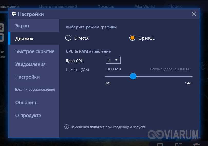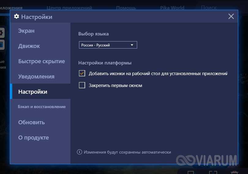 Чтобы открыть настройки эмулятора, необходимо кликнуть по стрелке вверху справа. Здесь можно изменить язык интерфейса (по умолчанию русский), разрешение экрана, режим графики, количество задействованных ядер процессора и объем выделенной памяти.