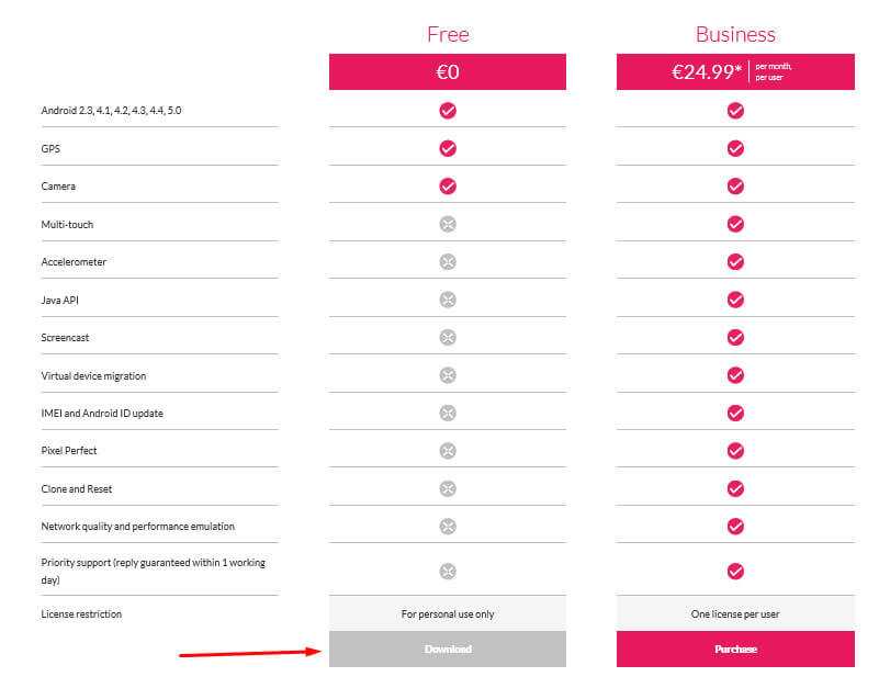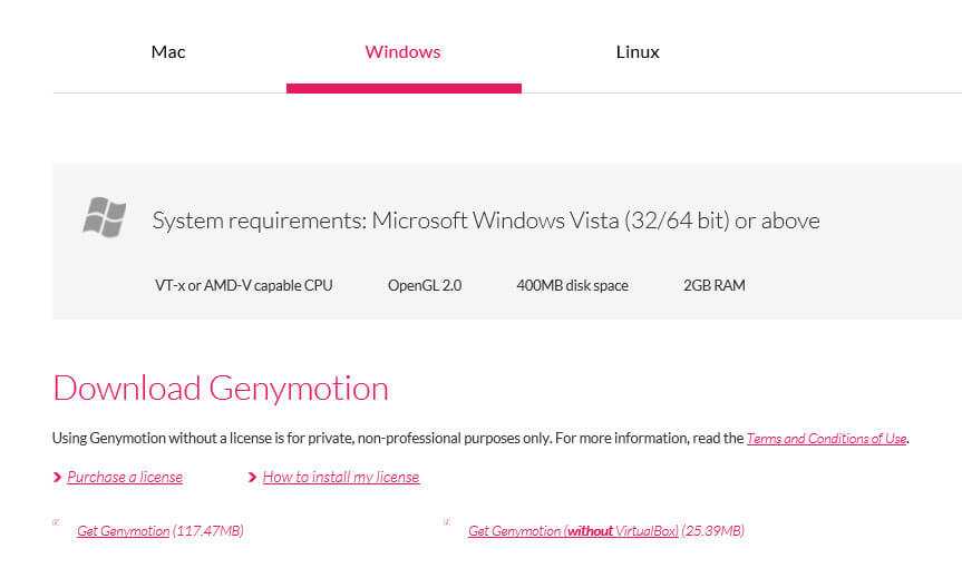 Можно и без просмотра нажать на кнопку Get Genymotion, после нажатия вы будете перенаправлены на страницу, где необходимо выбрать лицензию.
