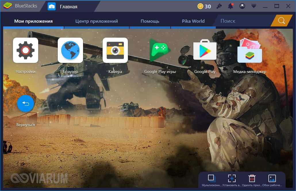Боковое меню активное, все кнопки при наведении «оживают» и появляются надписи, очень удобно для тех, кто только начинает свое знакомство с эмуляторами Андроид для Windows 10.