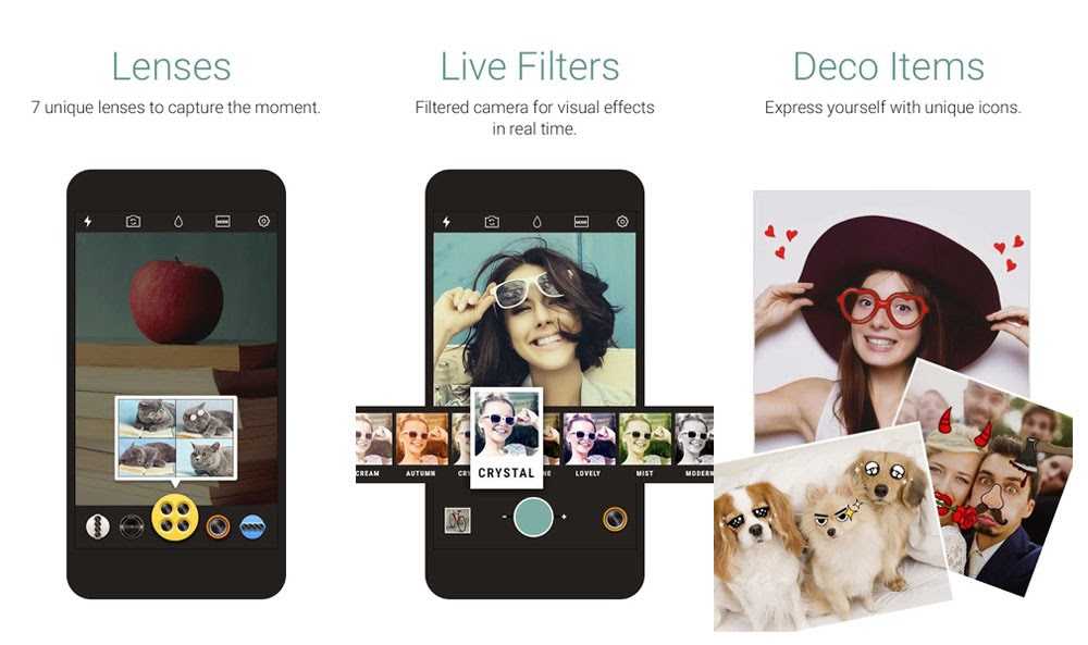 Она содержит в себе функцию распознавания лиц, что способствует максимально быстрому выбору изображения с лучшим качеством. Многие инструменты специально посвящены работе с селфи (есть возможность восполнить недостающие элементы макияж и даже улучшить причёску). В Cymera Camera предусмотрен набор линз для различных режимов съёмки.