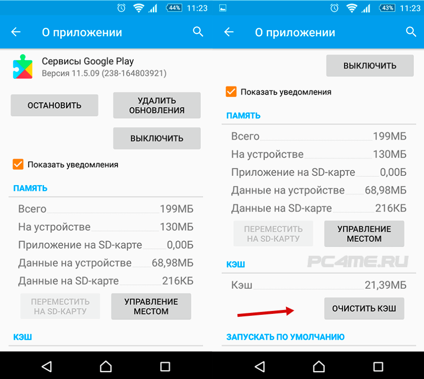 При помощи такого же алгоритма стереть данные и очистить кэш в программах «Сервисы Google Play» и «Google Services Framework».