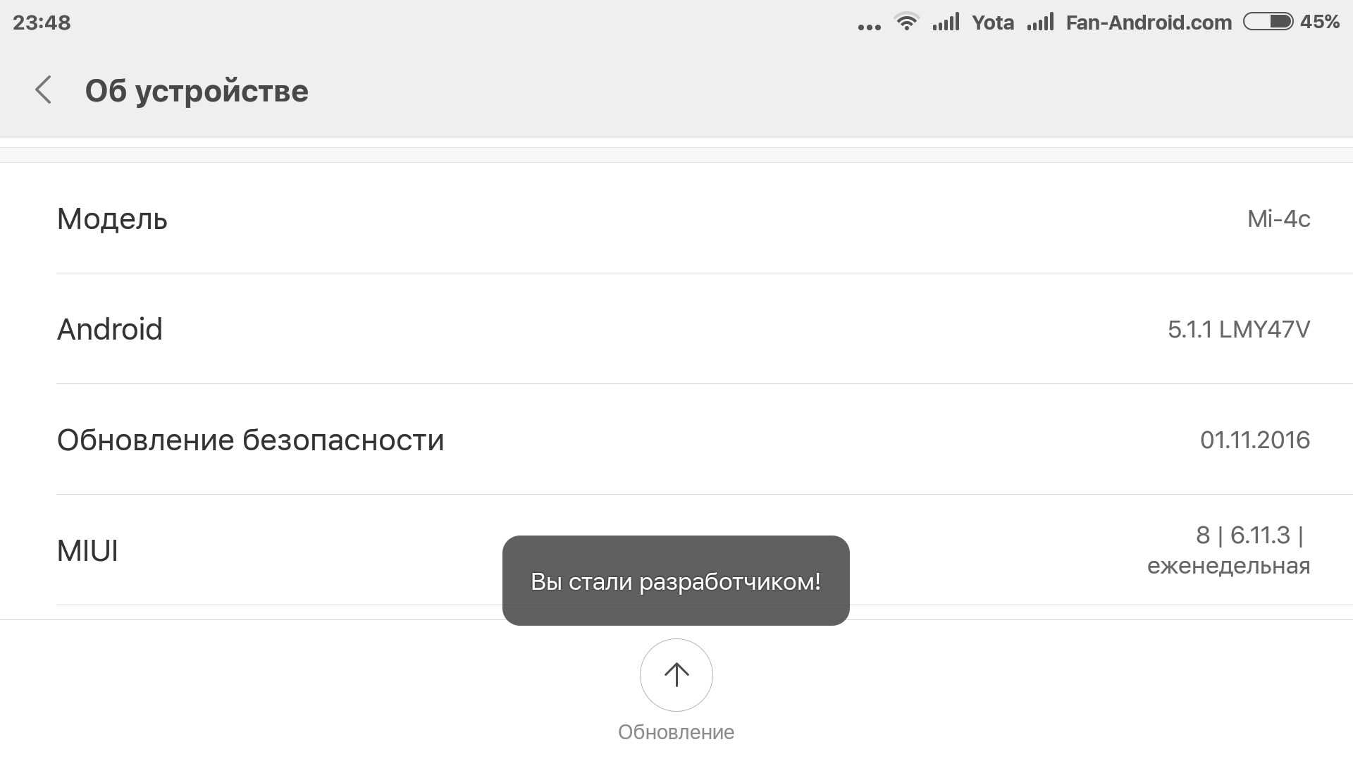 - Нажимаем кнопку «Обновление системы». Если ваша модель телефона поддерживает более новую версию, то она найдется и установится автоматически.Проверяем наличие обновления прошивки