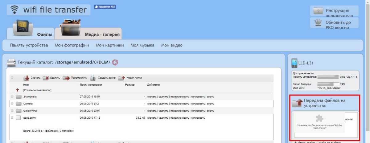 Далее пользователь увидит веб-интерфейс обменного сервиса, который обеспечивает доступ к папкам и файлам устройства под управлением Андроид.