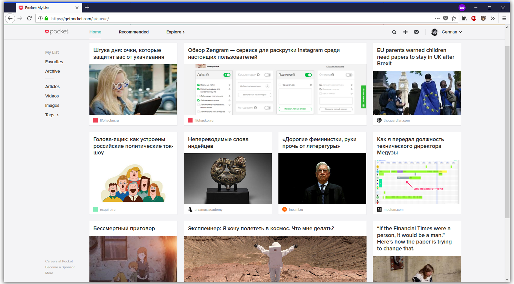 Pocket — это одно из самых популярных приложений для сохранения любимых материалов на потом. Главным преимуществом является синхронизация сразу на нескольких устройствах. Pocket сохраняет вашу ссылку на статью и автоматически загружает её для офлайн-просмотра. Также у него есть своя лента персонализированных рекомендаций, которая строится на анализе сохранённых вами материалов: если вам нравится читать в приложении кулинарные рецепты или статьи про итальянскую кухню, то в рекомендации попадёт самое интересное, что читали другие пользователи по этой теме.