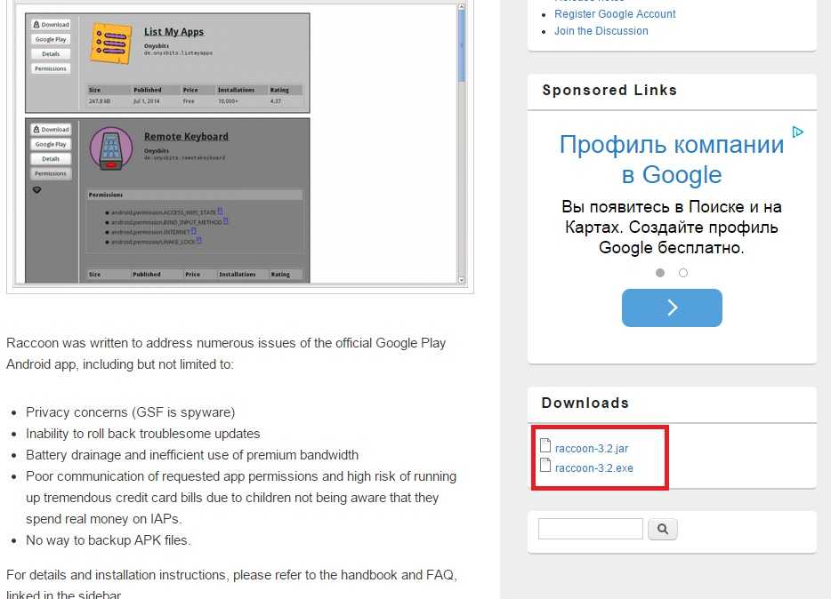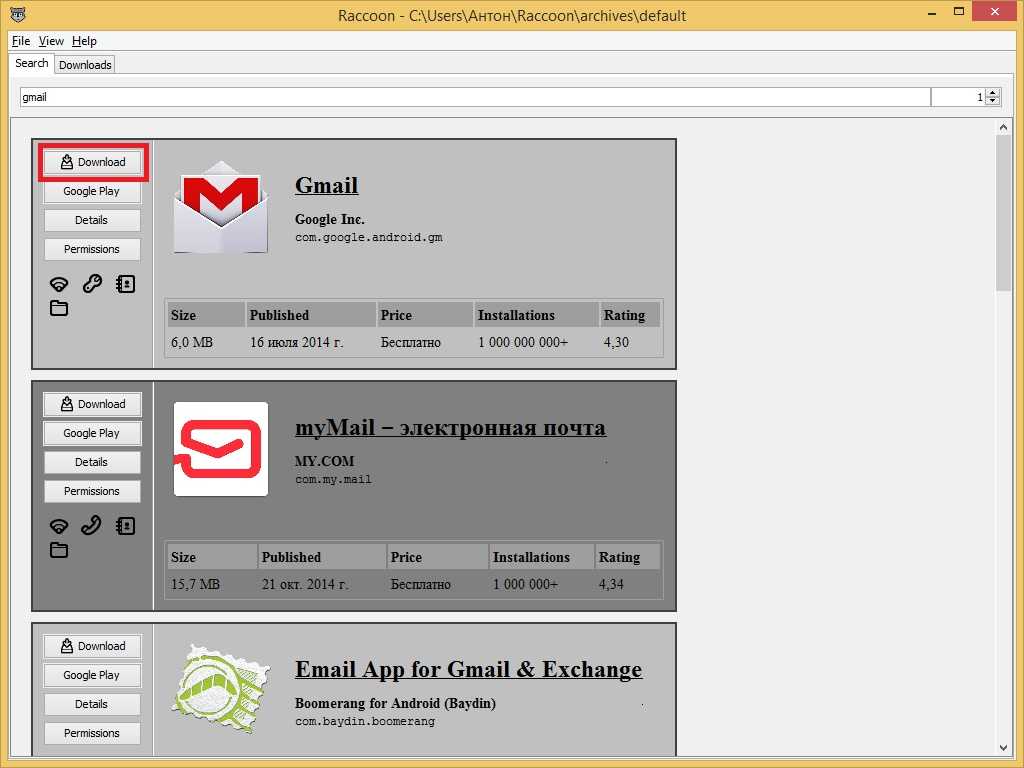 Один из самых популярных и часто используемых инструментов, с помощью которого можно легко извлечь установочный файл на компьютер прямо из фирменного магазина приложений Google. Программа позволяет работать с сервисом Google Play без всяких проблем, даже ее установка на ПК не требуется – портативная версия Raccoon APK Downloader может работать в любом удобном месте сразу после запуска.