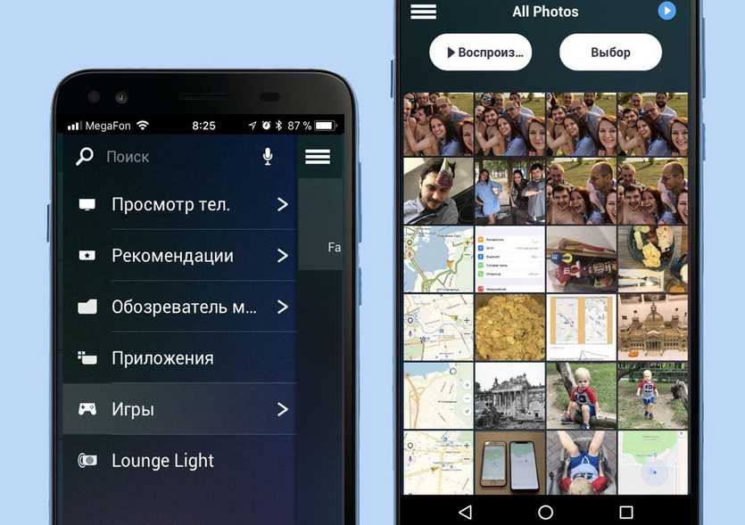 Вкладки бокового меню «Приложения» и «Игры» открывают на смартфоне полный перечень предустановленных на ТВ программ. Для запуска на телевизоре достаточно 1 тапа по экрану.