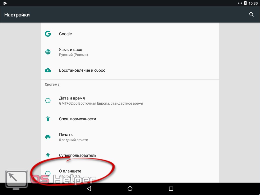 - Прокрутите содержимое окна в самый низ и выберите пункт, отмеченный на скриншоте. В Андроид 7.1 он называется «О планшете».