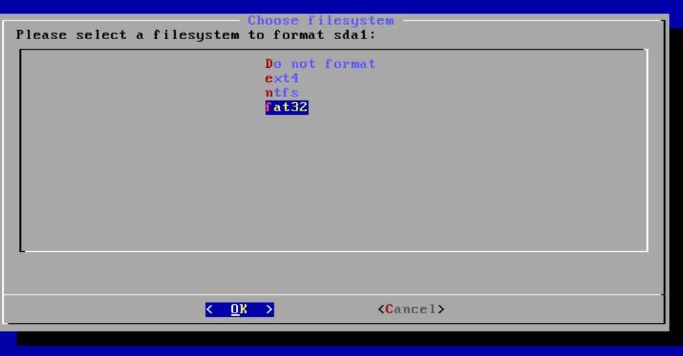 После этого вам будет предложено выбрать файловую систему для форматирования раздела. Выбираем ext