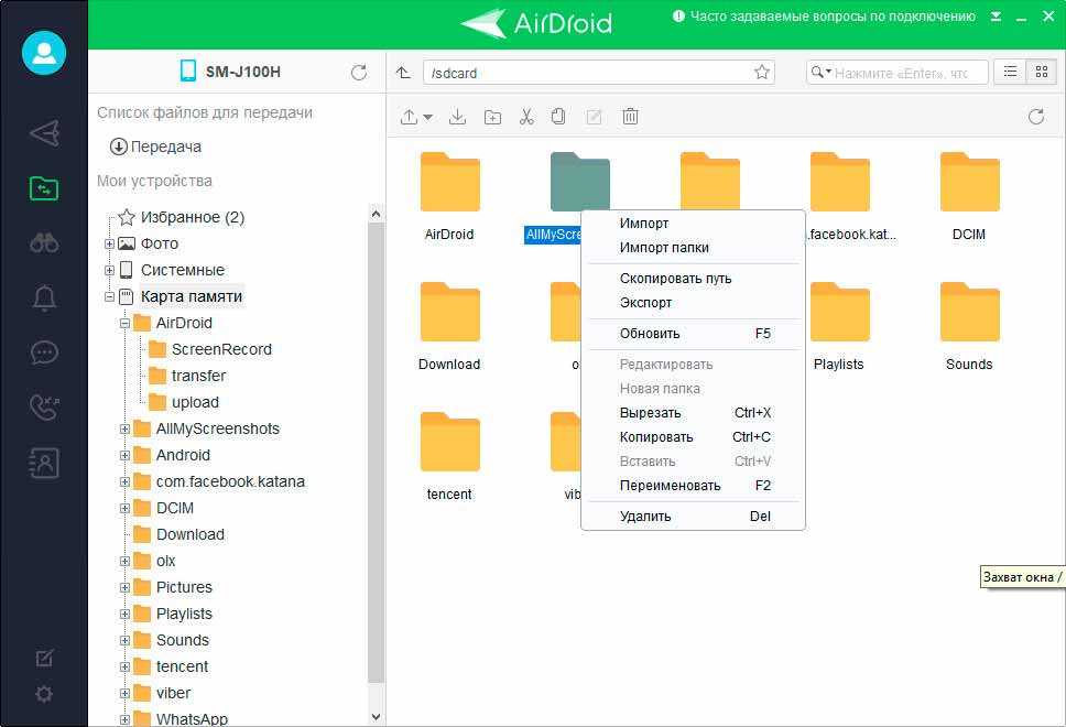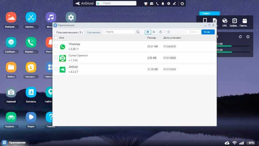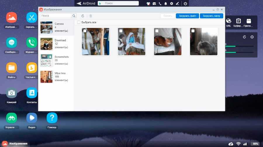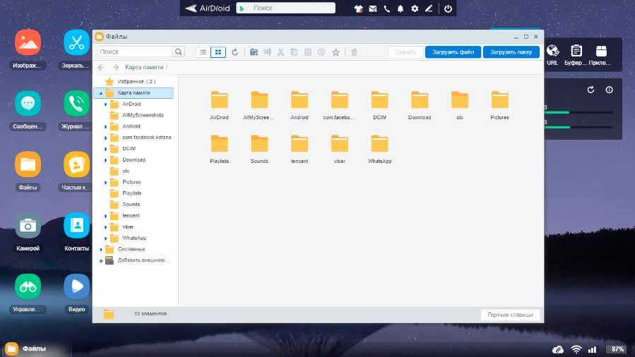 Использование десктопного клиента — наиболее удобный и функциональный вариант удаленного управления телефоном. Передача файлов и папок осуществляется простым их перетаскиванием в окно клиента, при этом файлы автоматически загружаются в каталог Transfer. Отправить с локального компьютера файл или папку можно также нажатием соответствующей иконки. Дополнительно поддерживается создание и отправка скриншотов. Полноценный обмен обеспечивает файловый менеджер, с помощью которого можно не только копировать данные с ПК на телефон и обратно, но и создавать удаленно папки, перемещать, удалять и просматривать файлы во встроенном вьювере.