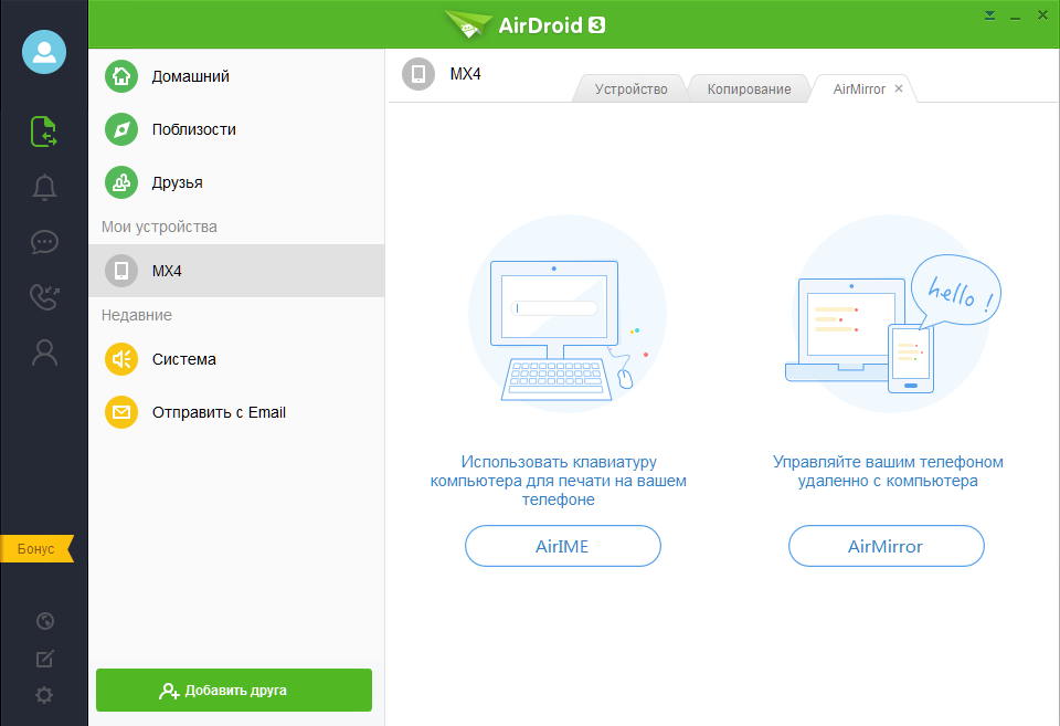 Также является довольно популярным приложением, через которое можно управлять другими смартфонами через компьютер. Кроме обычного управления, эта программа позволяет передавать различные файлы со смартфона на компьютер и обратно. Airmore позволяет подключить Android к Mac, iOS и Windows.