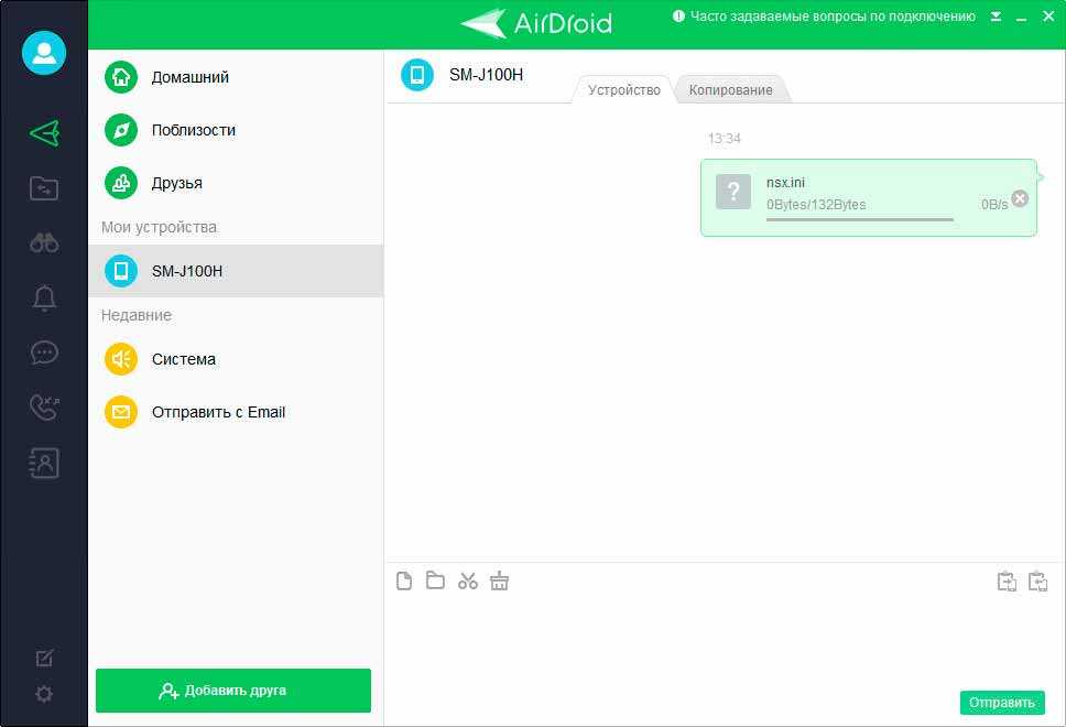 Чтобы передать файл с компьютера на удалённый гаджет, достаточно перетащить его на поле панели…