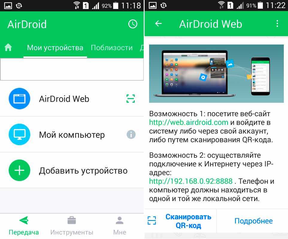 Вам понадобится установить на смартфон и компьютер соответствующие версии приложения, первое из которых будет служить сервером, а второе клиентом. AirDroid поддерживается удаленное управление также через браузер с помощью веб-клиента, доступного по адресу web.airdroid.com.
