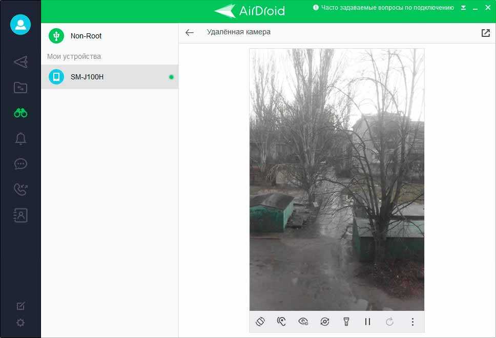 Выбрав на панели инструментов «Дистанционное управление», Вы можете включить основную или фронтальную камеру для наблюдения за происходящим. Удаленно подключить к телефону клавиатуру компьютера для набора текста, вывести на рабочий стол ПК экран мобильного устройства и открыть сеанс удаленного управления. Правда, эта функция поддерживается только на рутированных устройствах либо не рутированных, но подключенных к компьютеру по USB-кабелю. Также на панели инструментов Вы найдете средства управления уведомлениями, историей звонков, SMS и контактами.