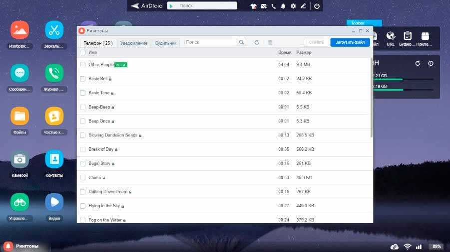 К сожалению, на момент написания материала, в AirMore отсутствует поддержка русского языка, тем не менее, почти все функции интуитивно понятны. Перечислю основные доступные возможности удаленного управления: