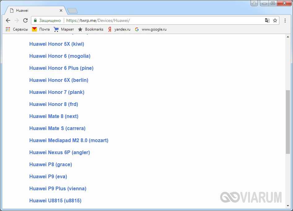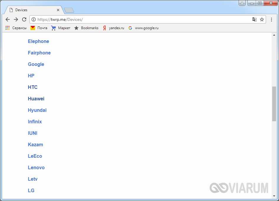 Теперь нужно скачать файл-образ TWRP Recovery конкретно для вашего устройства. Переходим на страницу https://twrp.me/Devices/ и выбираем в списке свою модель телефона.