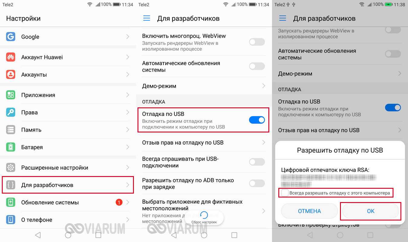 Итак, будем считать, bootloader разблокирован, и можно приступить к самой процедуре. Сначала необходимо установить на ПК утилиты ADB и Fastboot. После того, как это будет сделано, подключите телефон с Андроид к компьютеру через USB-кабель и включите на мобильном устройстве отладку по USB (Настройки – Для разработчиков – Отладка по USB).
