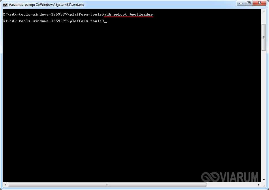Идем дальше. Открываем командную строку и выполняем команду adb reboot bootloader, после чего телефон должен перезагрузиться в режиме Fastboot (на экране смартфона появится соответствующая картинка).