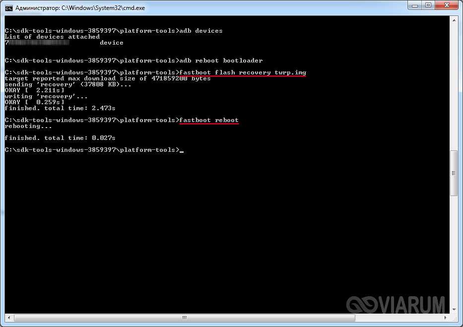 Если по каким-то причинам ни одна из возможных комбинаций клавиш не сработала, дополнительным способом вызова режима восстановления на смартфоне является использование утилит adb(Android Debug Bridge). Для подключения к смартфону через ADB необходимо: