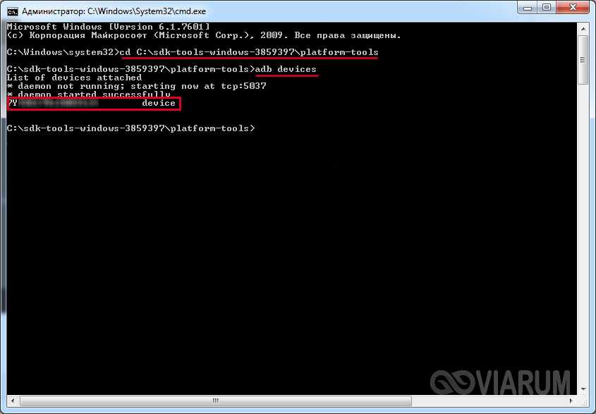 - Ввести команду “adb devices”. На экран будет выведено название подключенного устройства.