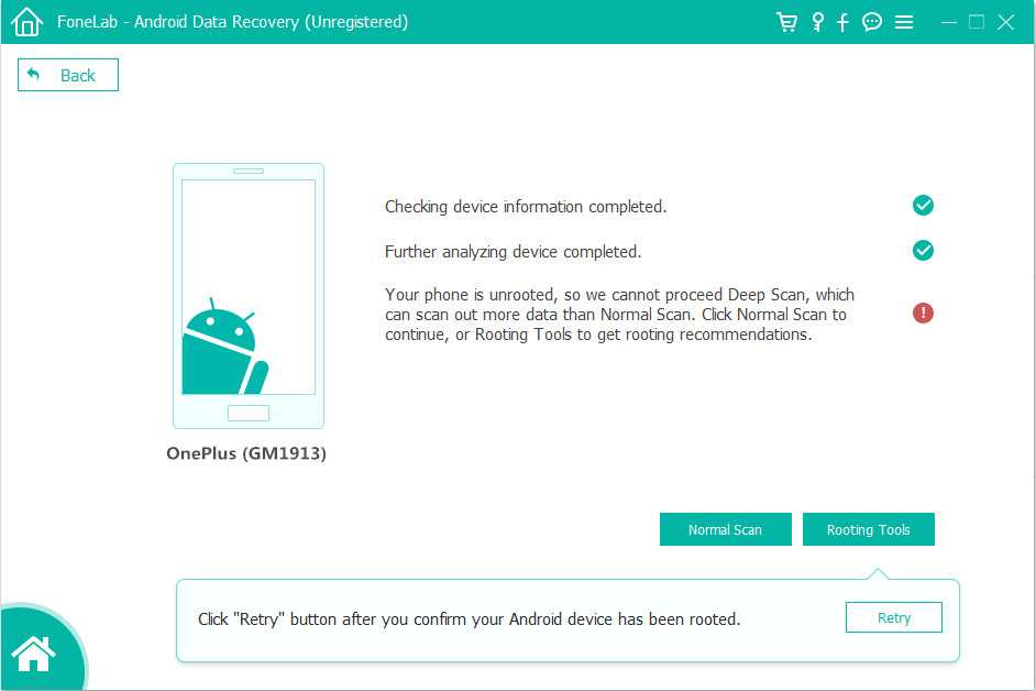 После рутирования, затем нажмите кнопку «Повторить», программа начнет сканирование потерянных и удаленных данных с вашего телефона Android.