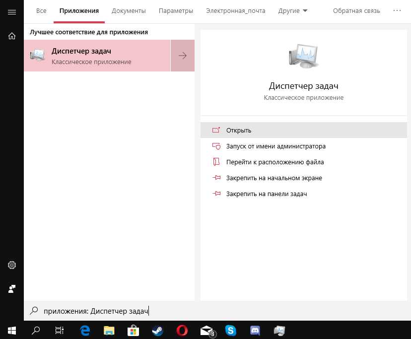 Теперь можно его запустить воспользовавшись, например, поиском Windows 10. Прямо в меню пуск начните вводить Диспетчер задач и нажмите Открыть. Можно выбрать соответствующий пункт в контекстном меню пуск или панели задач.