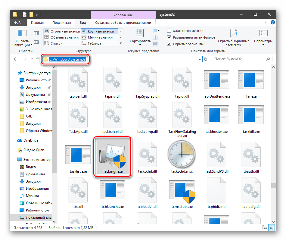 4. Многие задаются вопросом, где находится диспетчер задач в Windows 10. Данный инструмент располагается в директории Windows в каталоге System32. Перейдя в него, найдите исполняемый файл Taskmgr.exe, сделайте двойной клик ЛКМ.