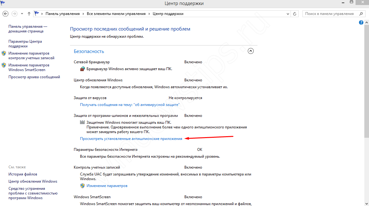 Основные действия полностью повторяют алгоритм из 7-й версии системы, но есть небольшое отличие. Пройдите в Панель управления и откройте «Центр Поддержки»