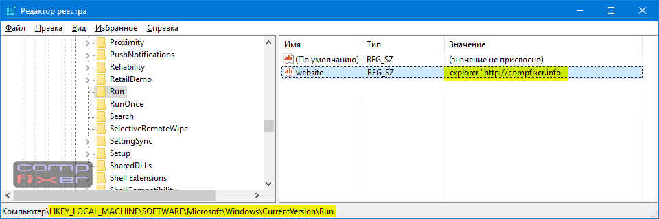 Добавляем сайт в автозагрузку, создав строковый ключ в ветке реестра
