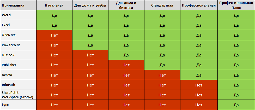 Базовый вариант содержит три приложения: PowerPoint, Word, Excel. В каждой из более расширенных версий последовательно добавляются OneNote, Outlook, Publisher, Access, InfoPath.