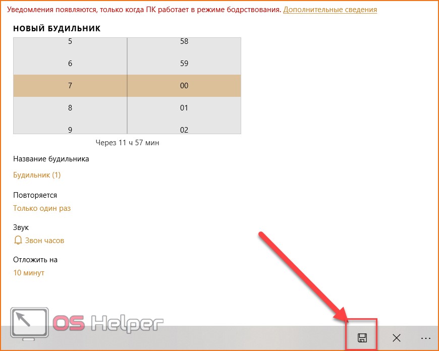Сразу поставьте отметку напротив пункта «Включить будильник».