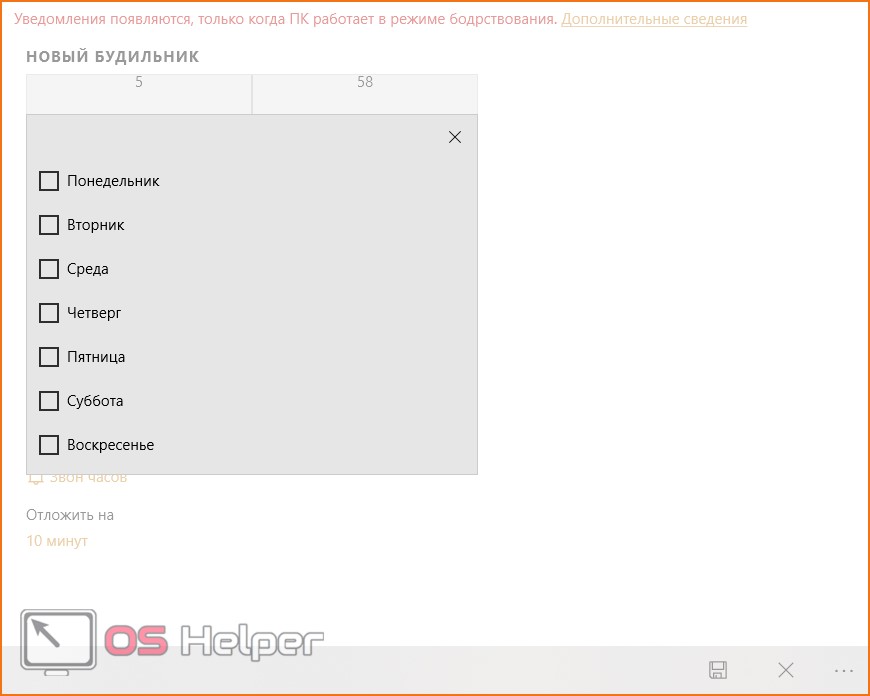 - галочками отметьте дни недели, когда будет срабатывать будильник;
