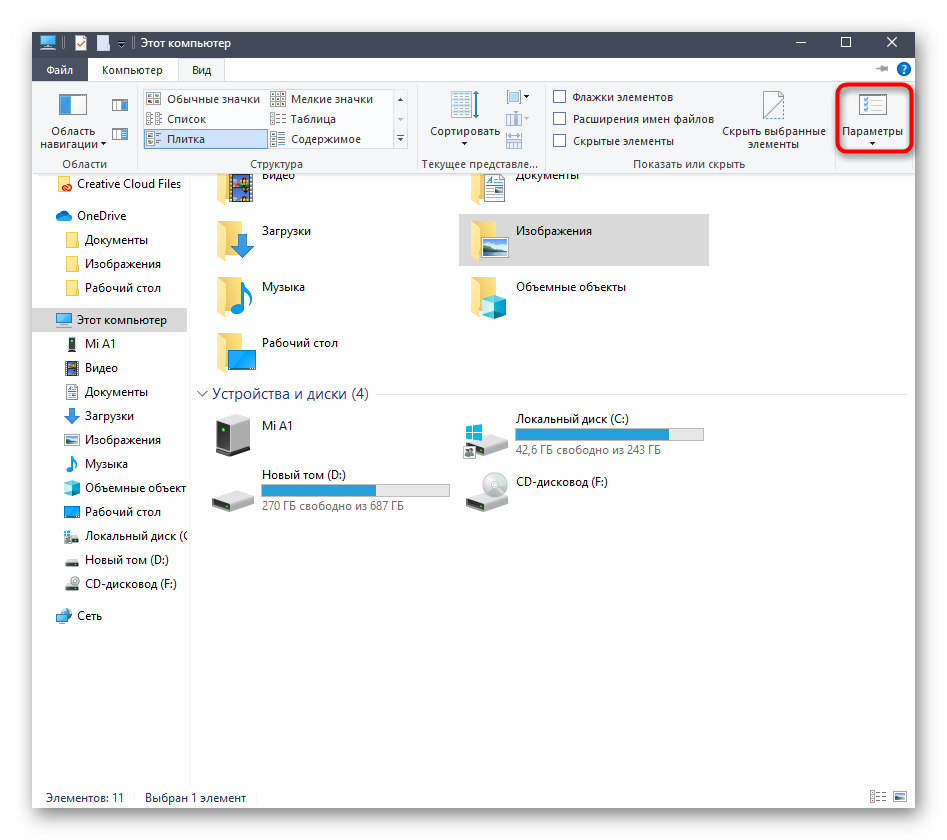 - Входим в «Проводник». В верхней панели нужно выбрать меню «Вид». Затем «Параметры»;