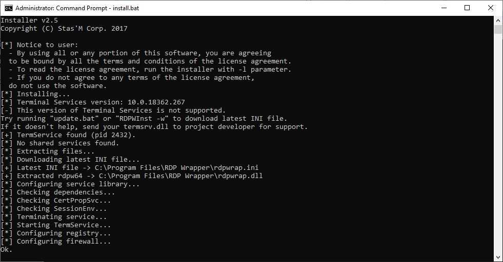Таким образом, RDPWrap будет работать даже при обновлении версии файла termsrv.dll, что позволяет не опасаться обновлений Windows.