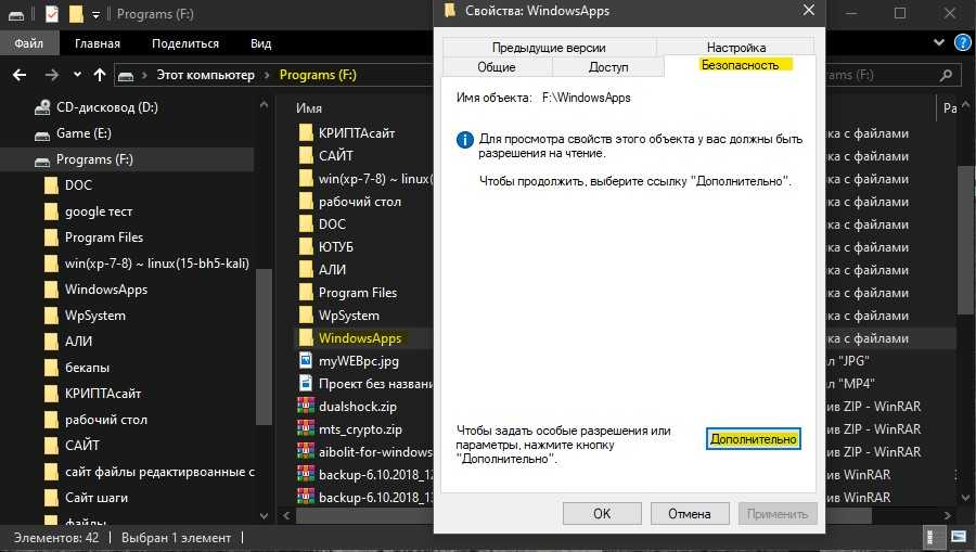 Шаг 2. Так как папка WindowsApps защищена, то нужно изменить права доступа, чтобы потом можно было её удалить. Перейдите в корень диска с папкой WindowsApps. Щелкните по папке правой кнопкой мыши и выберите «Свойства» в контекстном меню. Перейдите на вкладку «Безопасность» и нажмите «Дополнительно».