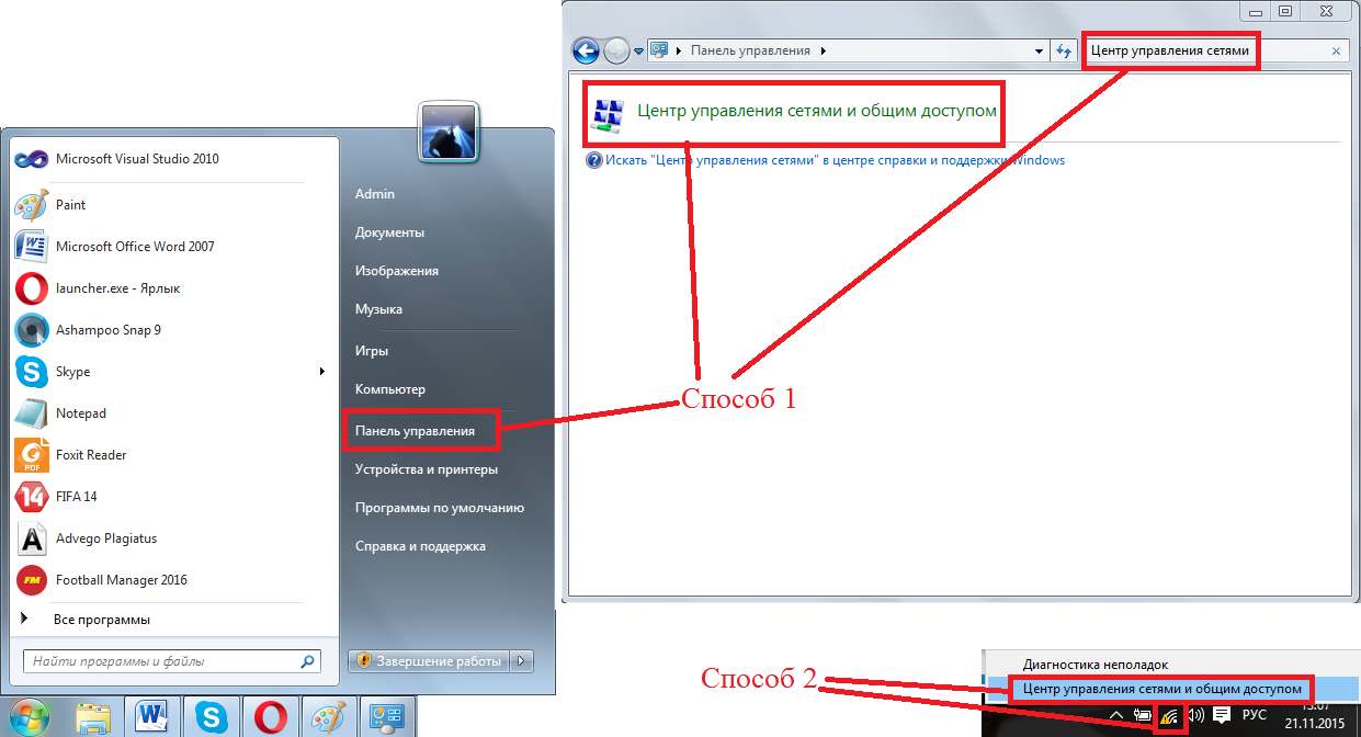 Рис. 1. Использование «Центра управления сетями…» двумя методами